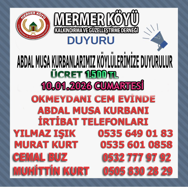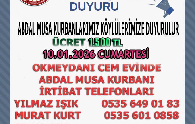 ABDAL MUSA KURBANLARIMIZ KÖYLÜLERİMİZE DUYURULUR